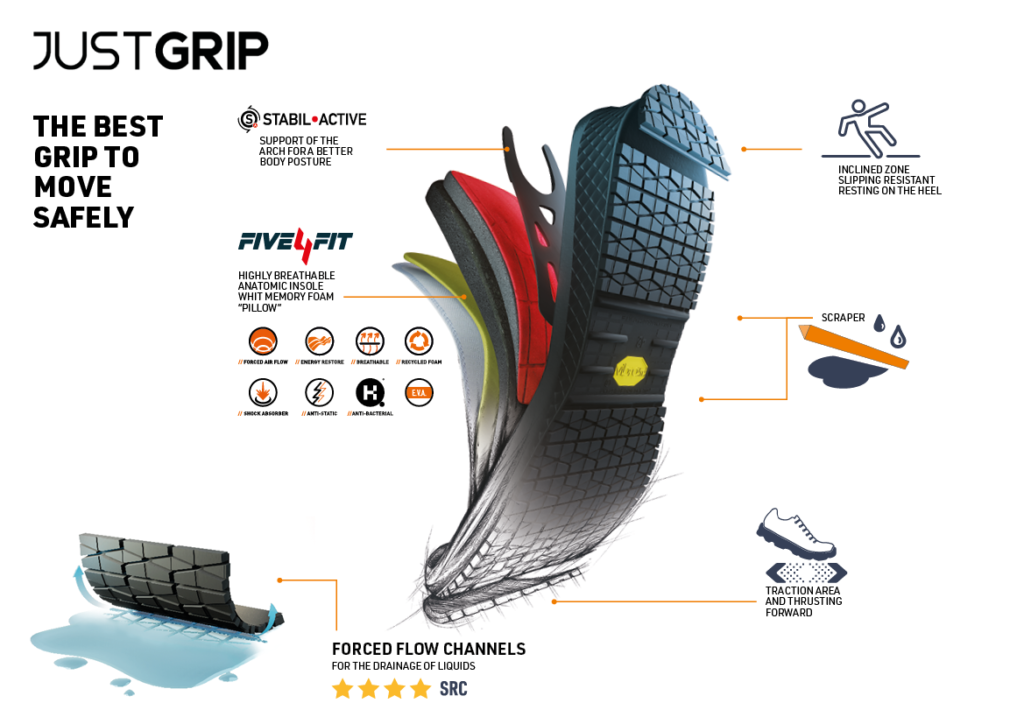 De nieuwe Just Grip Lijn presteert niet alleen uitzonderlijk goed wat betreft slipweerstand (slip resistentie, SRC) volgens de richtlijn EN ISO 20344:2011, maar scoort ook 4 sterren op het gebied van gezondheid en veiligheid.